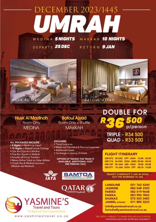 Disclaimer: Kindly check and confirm details with operators before booking. Package Information has been uploaded onto our website as received, and may have changed. Hotel Information has been sourced from websites like Google Maps, Wikimapia and Hotels.com. If any of the information is incorrect, kindly let us know via email: info@hajjumrahinfo.co.za - Shukran
