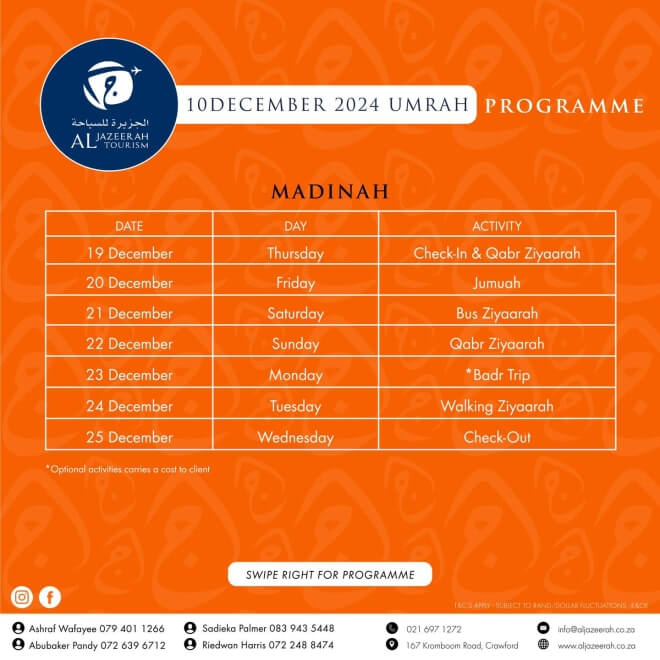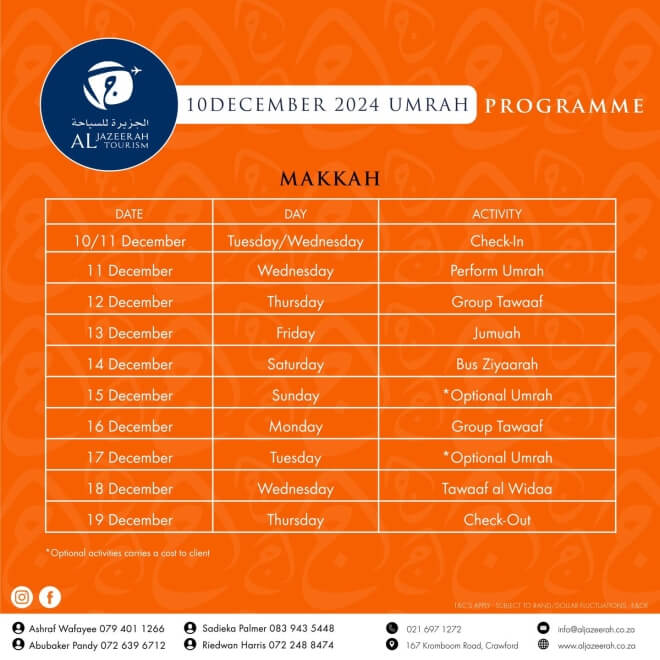 Disclaimer: Kindly check and confirm details with operators before booking. Package Information has been uploaded onto our website as received, and may have changed. Hotel Information has been sourced from websites like Google Maps, Wikimapia and Hotels.com. If any of the information is incorrect, kindly let us know via email: info@hajjumrahinfo.co.za - Shukran