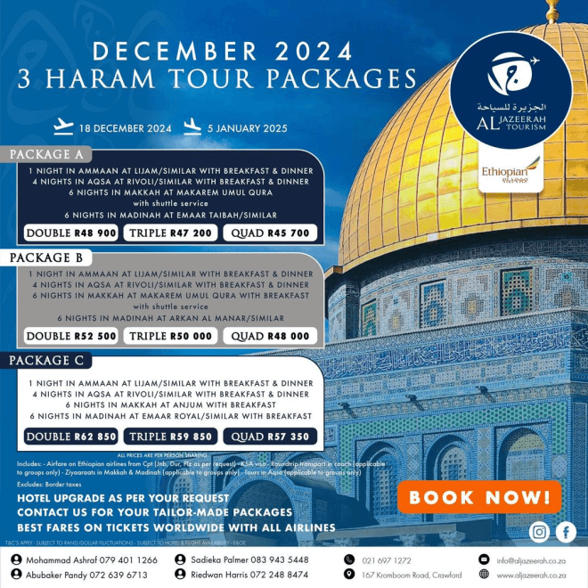 Disclaimer: Kindly check and confirm details with operators before booking. Package Information has been uploaded onto our website as received, and may have changed. Hotel Information has been sourced from websites like Google Maps, Wikimapia and Hotels.com. If any of the information is incorrect, kindly let us know via email: info@hajjumrahinfo.co.za - Shukran