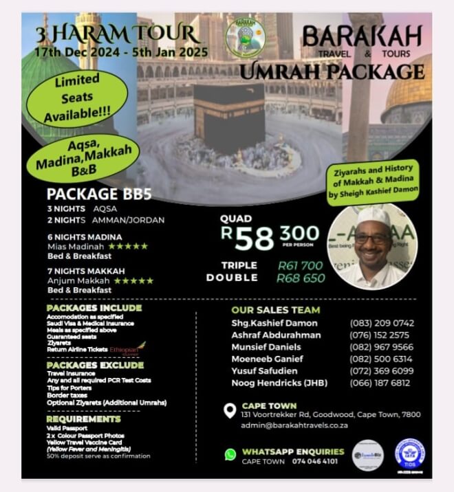 Disclaimer: Kindly check and confirm details with operators before booking. Package Information has been uploaded onto our website as received, and may have changed. Hotel Information has been sourced from websites like Google Maps, Wikimapia and Hotels.com. If any of the information is incorrect, kindly let us know via email: info@hajjumrahinfo.co.za - Shukran