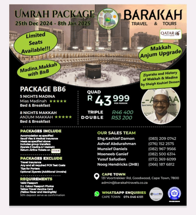 Disclaimer: Kindly check and confirm details with operators before booking. Package Information has been uploaded onto our website as received, and may have changed. Hotel Information has been sourced from websites like Google Maps, Wikimapia and Hotels.com. If any of the information is incorrect, kindly let us know via email: info@hajjumrahinfo.co.za - Shukran