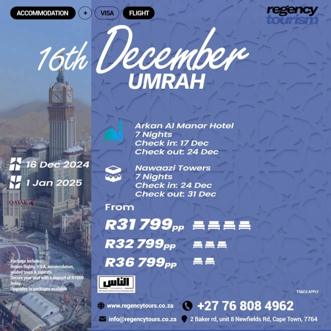 Disclaimer: Kindly check and confirm details with operators before booking. Package Information has been uploaded onto our website as received, and may have changed. Hotel Information has been sourced from websites like Google Maps, Wikimapia and Hotels.com. If any of the information is incorrect, kindly let us know via email: info@hajjumrahinfo.co.za - Shukran