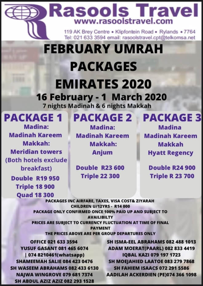 Disclaimer: Kindly check and confirm details with operators before booking. Package Information has been uploaded onto our website as received, and may have changed. Hotel Information has been sourced from websites like Google Maps, Wikimapia and Hotels.com. If any of the information is incorrect, kindly let us know via email: info@hajjumrahinfo.co.za - Shukran