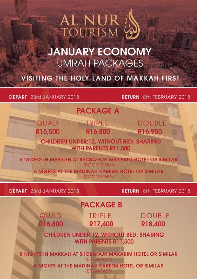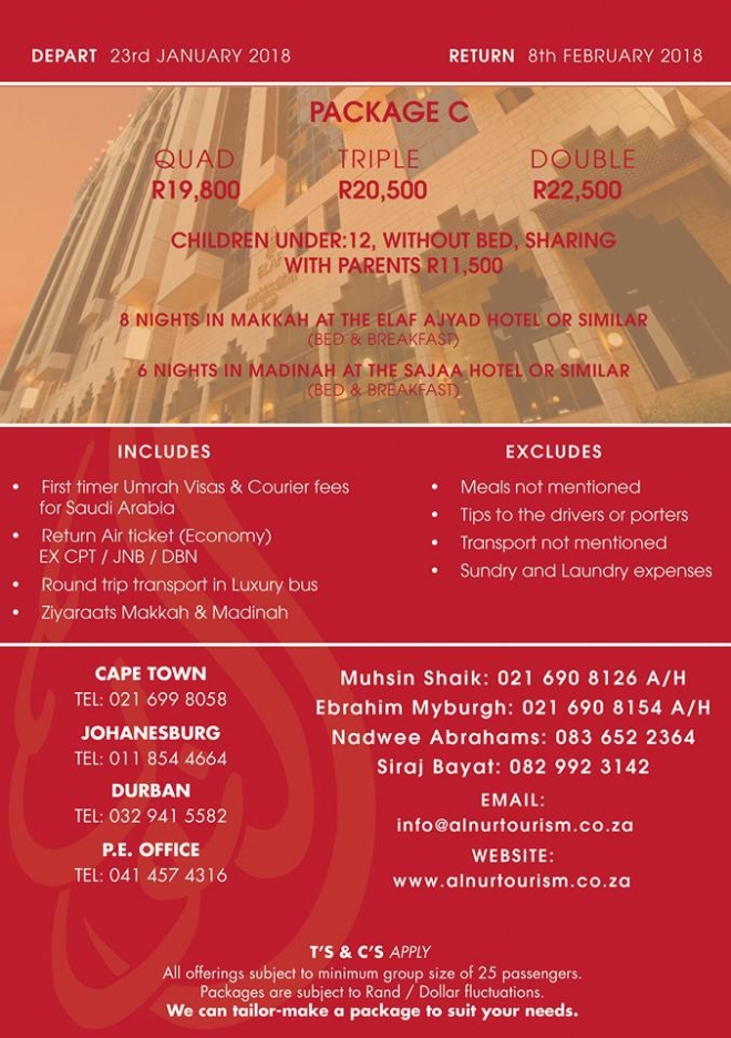 Disclaimer: Kindly check and confirm details with operators before booking. Package Information has been uploaded onto our website as received, and may have changed. Hotel Information has been sourced from websites like Google Maps, Wikimapia and Hotels.com. If any of the information is incorrect, kindly let us know via email: info@hajjumrahinfo.co.za - Shukran