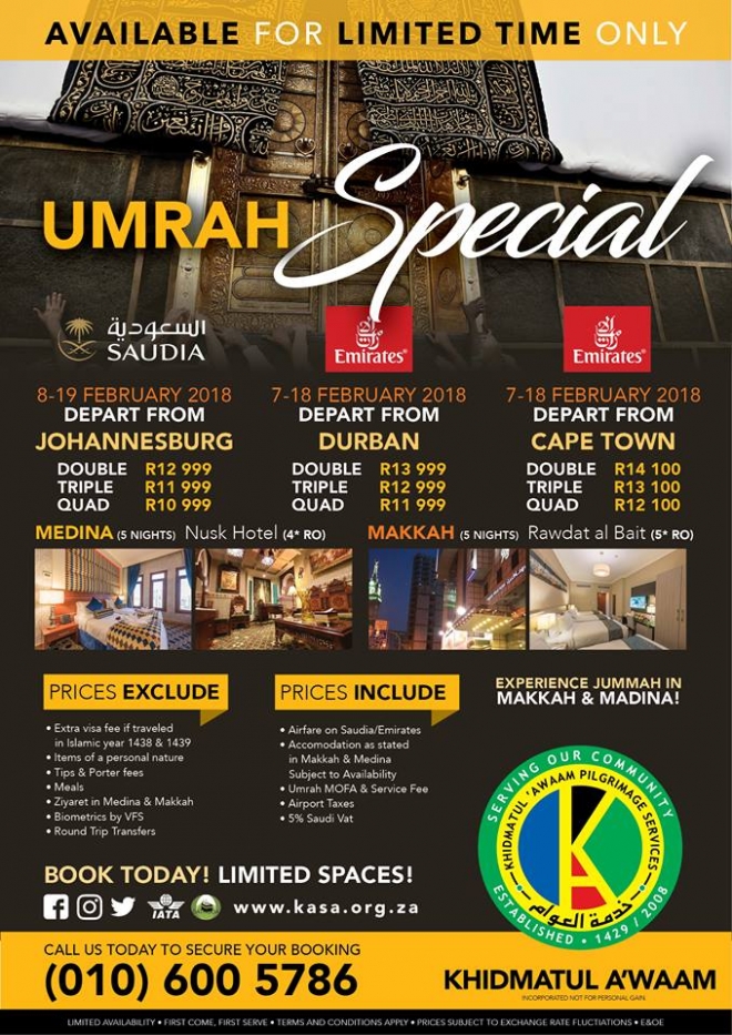 Disclaimer: Kindly check and confirm details with operators before booking. Package Information has been uploaded onto our website as received, and may have changed. Hotel Information has been sourced from websites like Google Maps, Wikimapia and Hotels.com. If any of the information is incorrect, kindly let us know via email: info@hajjumrahinfo.co.za - Shukran