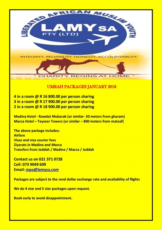 Disclaimer: Kindly check and confirm details with operators before booking. Package Information has been uploaded onto our website as received, and may have changed. Hotel Information has been sourced from websites like Google Maps, Wikimapia and Hotels.com. If any of the information is incorrect, kindly let us know via email: info@hajjumrahinfo.co.za - Shukran