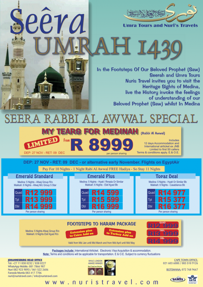 Disclaimer: Kindly check and confirm details with operators before booking. Package Information has been uploaded onto our website as received, and may have changed. Hotel Information has been sourced from websites like Google Maps, Wikimapia and Hotels.com. If any of the information is incorrect, kindly let us know via email: info@hajjumrahinfo.co.za - Shukran