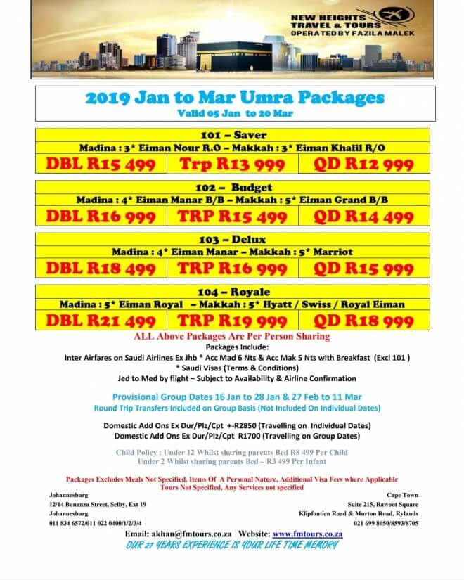 Disclaimer: Kindly check and confirm details with operators before booking. Package Information has been uploaded onto our website as received, and may have changed. Hotel Information has been sourced from websites like Google Maps, Wikimapia and Hotels.com. If any of the information is incorrect, kindly let us know via email: info@hajjumrahinfo.co.za - Shukran