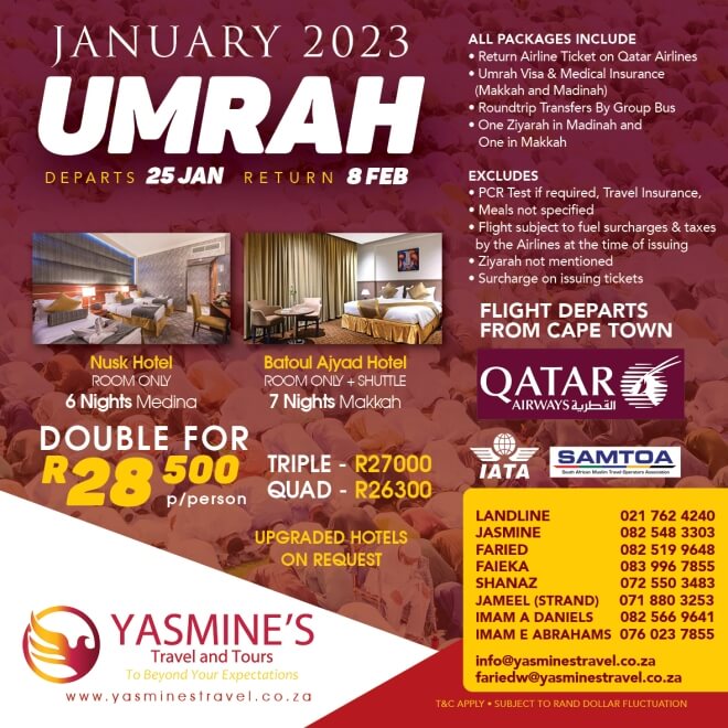 Disclaimer: Kindly check and confirm details with operators before booking. Package Information has been uploaded onto our website as received, and may have changed. Hotel Information has been sourced from websites like Google Maps, Wikimapia and Hotels.com. If any of the information is incorrect, kindly let us know via email: info@hajjumrahinfo.co.za - Shukran