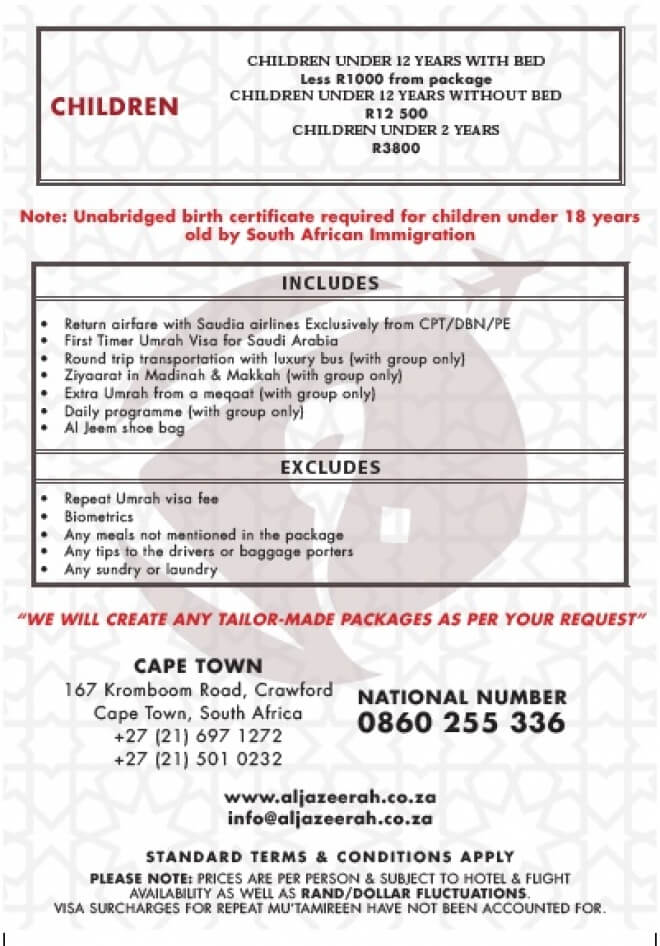 Disclaimer: Kindly check and confirm details with operators before booking. Package Information has been uploaded onto our website as received, and may have changed. Hotel Information has been sourced from websites like Google Maps, Wikimapia and Hotels.com. If any of the information is incorrect, kindly let us know via email: info@hajjumrahinfo.co.za - Shukran