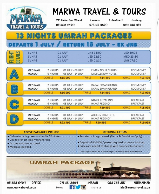 Disclaimer: Kindly check and confirm details with operators before booking. Package Information has been uploaded onto our website as received, and may have changed. Hotel Information has been sourced from websites like Google Maps, Wikimapia and Hotels.com. If any of the information is incorrect, kindly let us know via email: info@hajjumrahinfo.co.za - Shukran