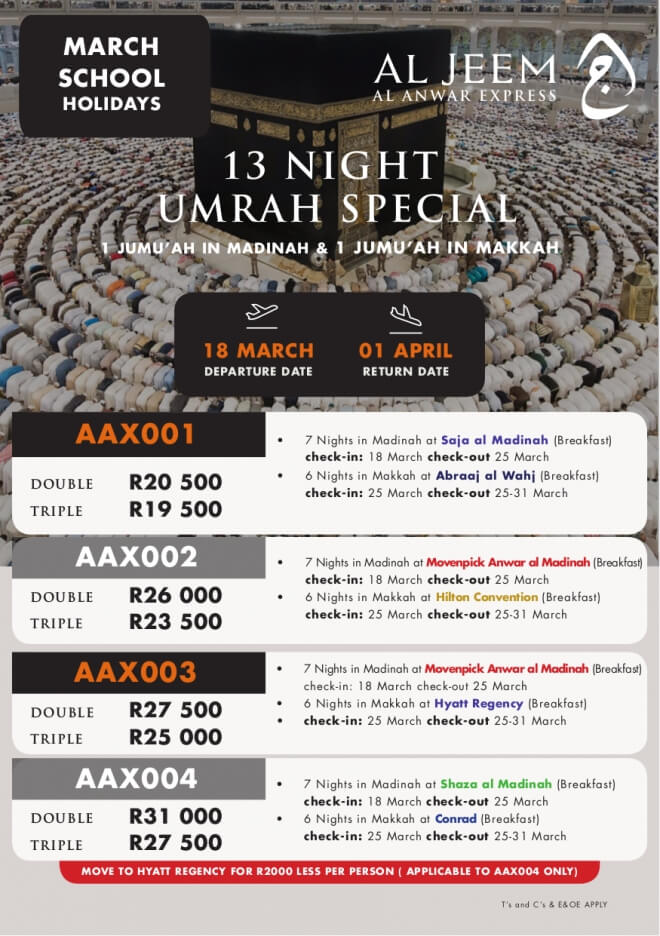 Disclaimer: Kindly check and confirm details with operators before booking. Package Information has been uploaded onto our website as received, and may have changed. Hotel Information has been sourced from websites like Google Maps, Wikimapia and Hotels.com. If any of the information is incorrect, kindly let us know via email: info@hajjumrahinfo.co.za - Shukran