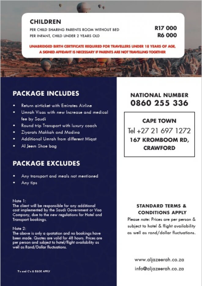 Disclaimer: Kindly check and confirm details with operators before booking. Package Information has been uploaded onto our website as received, and may have changed. Hotel Information has been sourced from websites like Google Maps, Wikimapia and Hotels.com. If any of the information is incorrect, kindly let us know via email: info@hajjumrahinfo.co.za - Shukran