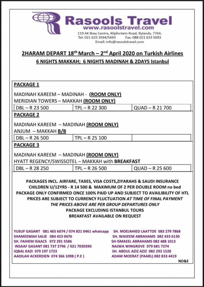 Disclaimer: Kindly check and confirm details with operators before booking. Package Information has been uploaded onto our website as received, and may have changed. Hotel Information has been sourced from websites like Google Maps, Wikimapia and Hotels.com. If any of the information is incorrect, kindly let us know via email: info@hajjumrahinfo.co.za - Shukran