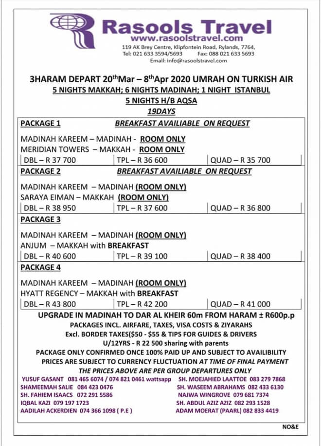 Disclaimer: Kindly check and confirm details with operators before booking. Package Information has been uploaded onto our website as received, and may have changed. Hotel Information has been sourced from websites like Google Maps, Wikimapia and Hotels.com. If any of the information is incorrect, kindly let us know via email: info@hajjumrahinfo.co.za - Shukran