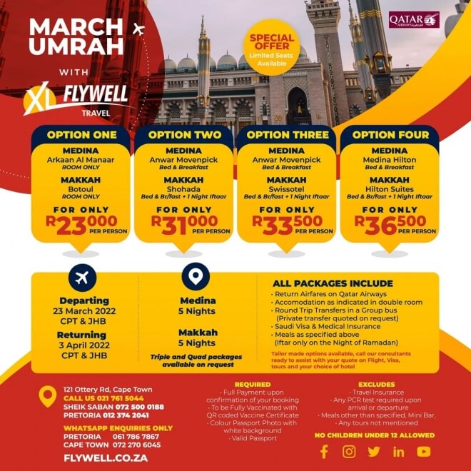 Disclaimer: Kindly check and confirm details with operators before booking. Package Information has been uploaded onto our website as received, and may have changed. Hotel Information has been sourced from websites like Google Maps, Wikimapia and Hotels.com. If any of the information is incorrect, kindly let us know via email: info@hajjumrahinfo.co.za - Shukran