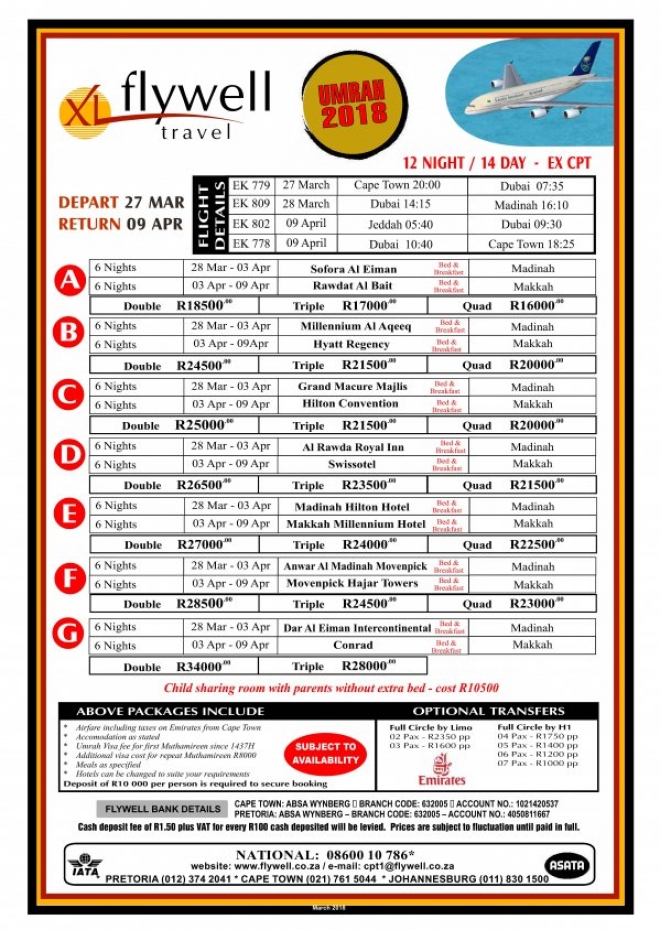 Disclaimer: Kindly check and confirm details with operators before booking. Package Information has been uploaded onto our website as received, and may have changed. Hotel Information has been sourced from websites like Google Maps, Wikimapia and Hotels.com. If any of the information is incorrect, kindly let us know via email: info@hajjumrahinfo.co.za - Shukran