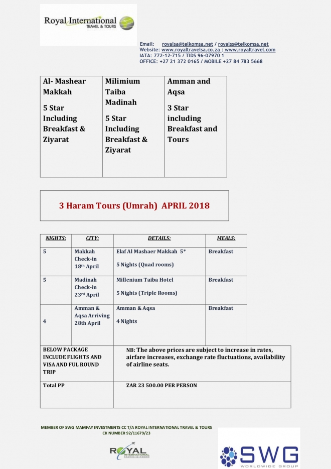 Royal International - 3 Haram Tours (Umrah) April 2018