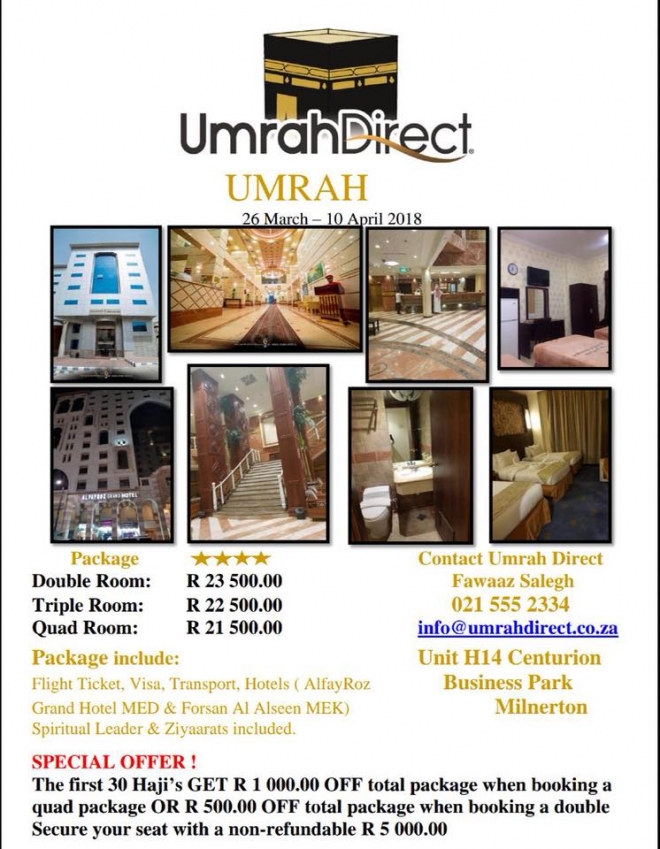 Disclaimer: Kindly check and confirm details with operators before booking. Package Information has been uploaded onto our website as received, and may have changed. Hotel Information has been sourced from websites like Google Maps, Wikimapia and Hotels.com. If any of the information is incorrect, kindly let us know via email: info@hajjumrahinfo.co.za - Shukran