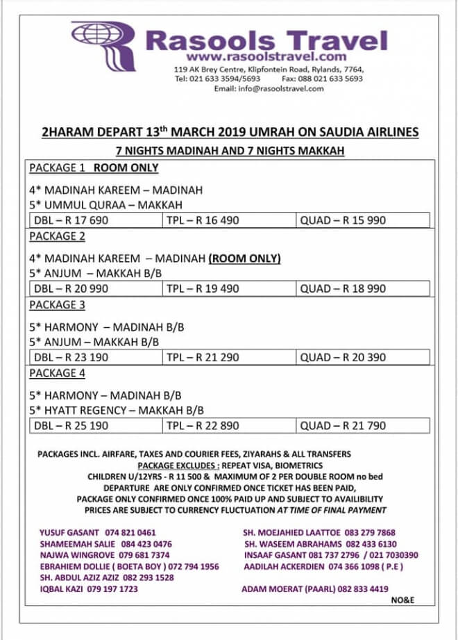 Disclaimer: Kindly check and confirm details with operators before booking. Package Information has been uploaded onto our website as received, and may have changed. Hotel Information has been sourced from websites like Google Maps, Wikimapia and Hotels.com. If any of the information is incorrect, kindly let us know via email: info@hajjumrahinfo.co.za - Shukran