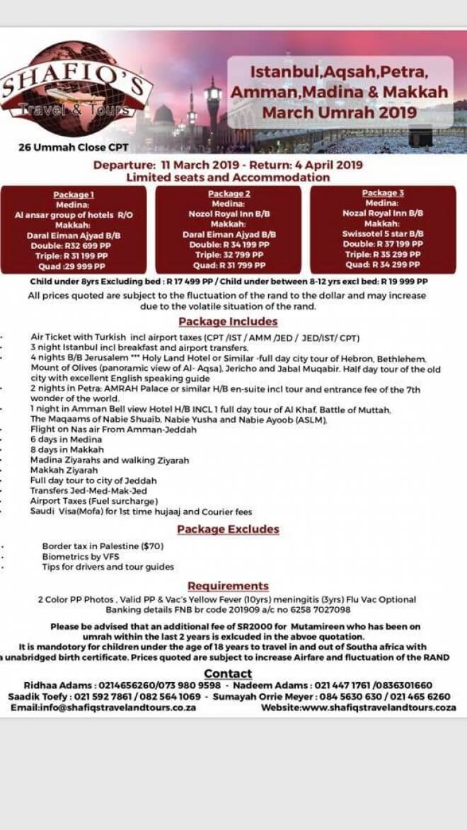 Disclaimer: Kindly check and confirm details with operators before booking. Package Information has been uploaded onto our website as received, and may have changed. Hotel Information has been sourced from websites like Google Maps, Wikimapia and Hotels.com. If any of the information is incorrect, kindly let us know via email: info@hajjumrahinfo.co.za - Shukran