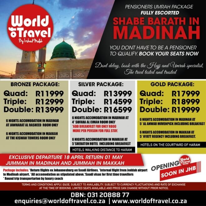 Disclaimer: Kindly check and confirm details with operators before booking. Package Information has been uploaded onto our website as received, and may have changed. Hotel Information has been sourced from websites like Google Maps, Wikimapia and Hotels.com. If any of the information is incorrect, kindly let us know via email: info@hajjumrahinfo.co.za - Shukran