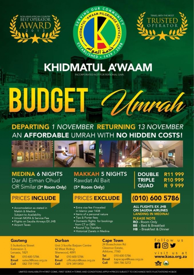 Disclaimer: Kindly check and confirm details with operators before booking. Package Information has been uploaded onto our website as received, and may have changed. Hotel Information has been sourced from websites like Google Maps, Wikimapia and Hotels.com. If any of the information is incorrect, kindly let us know via email: info@hajjumrahinfo.co.za - Shukran