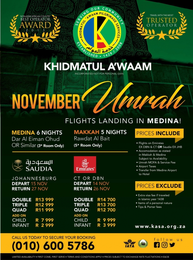 Khidmatul Awaam - November Umrah (Via CT or DBN - Emirates)