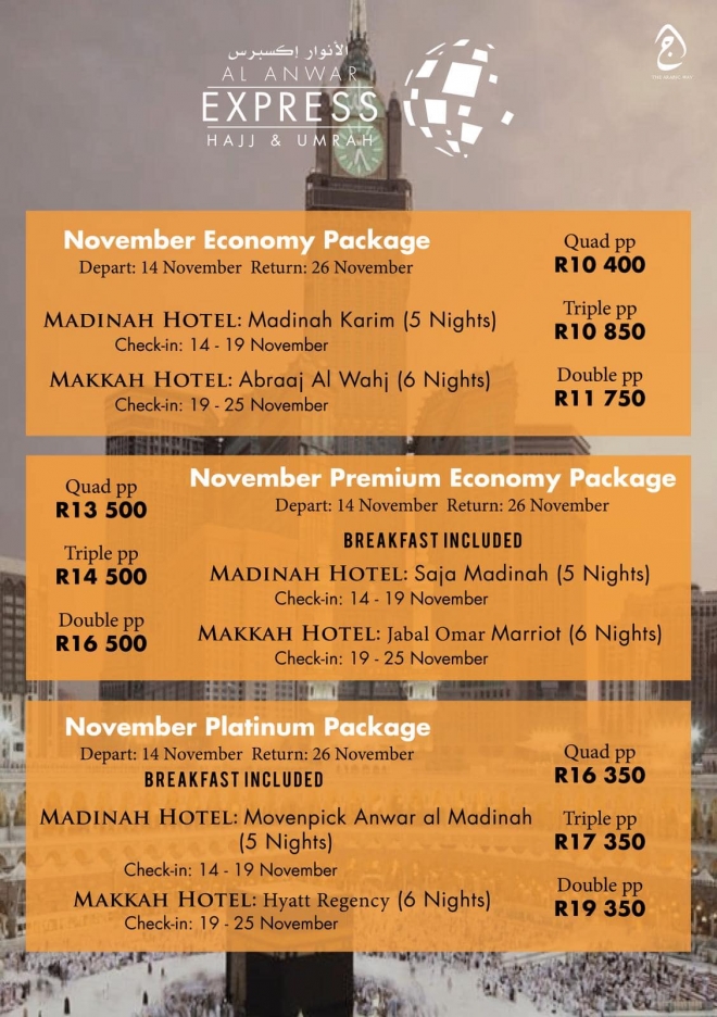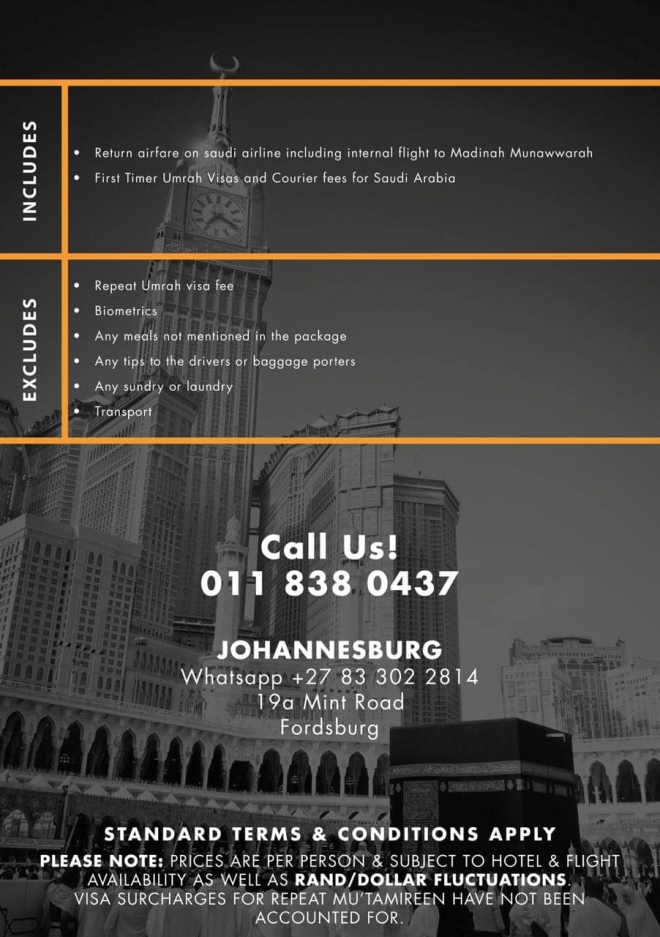 Disclaimer: Kindly check and confirm details with operators before booking. Package Information has been uploaded onto our website as received, and may have changed. Hotel Information has been sourced from websites like Google Maps, Wikimapia and Hotels.com. If any of the information is incorrect, kindly let us know via email: info@hajjumrahinfo.co.za - Shukran