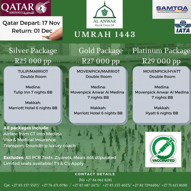 Disclaimer: Kindly check and confirm details with operators before booking. Package Information has been uploaded onto our website as received, and may have changed. Hotel Information has been sourced from websites like Google Maps, Wikimapia and Hotels.com. If any of the information is incorrect, kindly let us know via email: info@hajjumrahinfo.co.za - Shukran