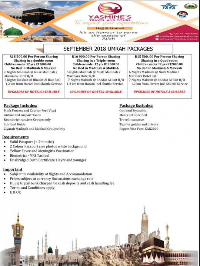Disclaimer: Kindly check and confirm details with operators before booking. Package Information has been uploaded onto our website as received, and may have changed. Hotel Information has been sourced from websites like Google Maps, Wikimapia and Hotels.com. If any of the information is incorrect, kindly let us know via email: info@hajjumrahinfo.co.za - Shukran
