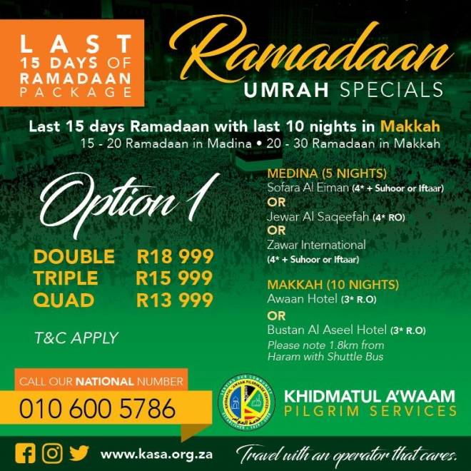 Disclaimer: Kindly check and confirm details with operators before booking. Package Information has been uploaded onto our website as received, and may have changed. Hotel Information has been sourced from websites like Google Maps, Wikimapia and Hotels.com. If any of the information is incorrect, kindly let us know via email: info@hajjumrahinfo.co.za - Shukran