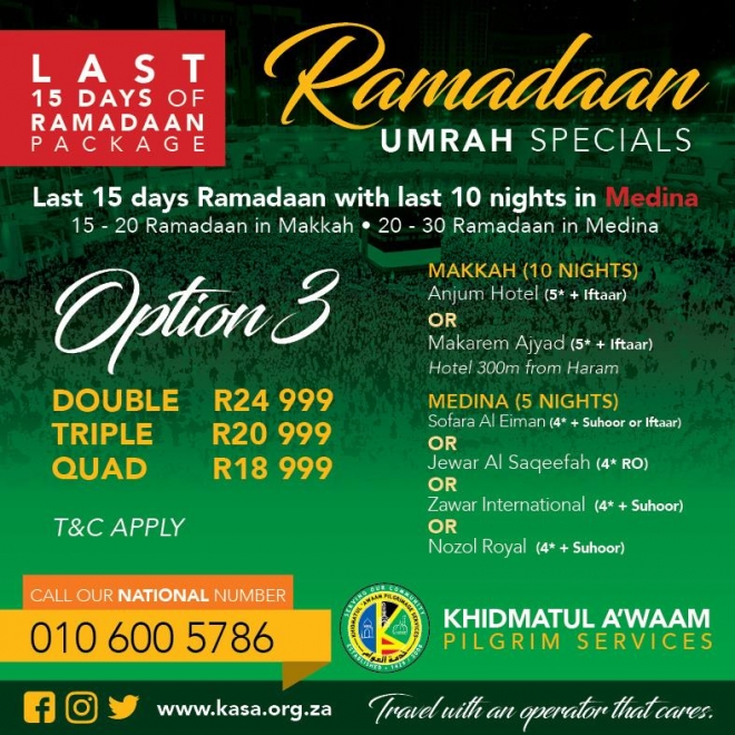 Disclaimer: Kindly check and confirm details with operators before booking. Package Information has been uploaded onto our website as received, and may have changed. Hotel Information has been sourced from websites like Google Maps, Wikimapia and Hotels.com. If any of the information is incorrect, kindly let us know via email: info@hajjumrahinfo.co.za - Shukran
