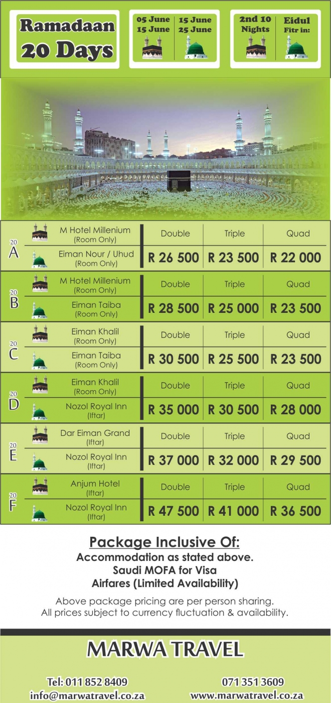 Disclaimer: Kindly check and confirm details with operators before booking. Package Information has been uploaded onto our website as received, and may have changed. Hotel Information has been sourced from websites like Google Maps, Wikimapia and Hotels.com. If any of the information is incorrect, kindly let us know via email: info@hajjumrahinfo.co.za - Shukran