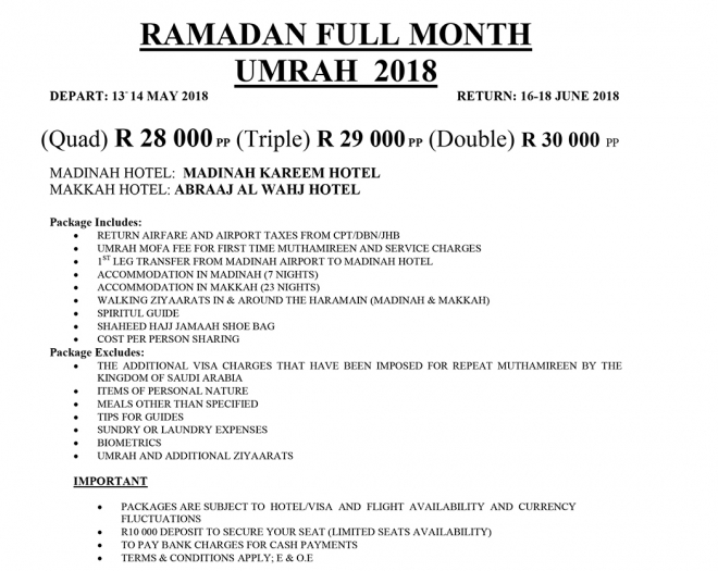Source: http://www.shaheedhajj.co.za/umrah2018.html