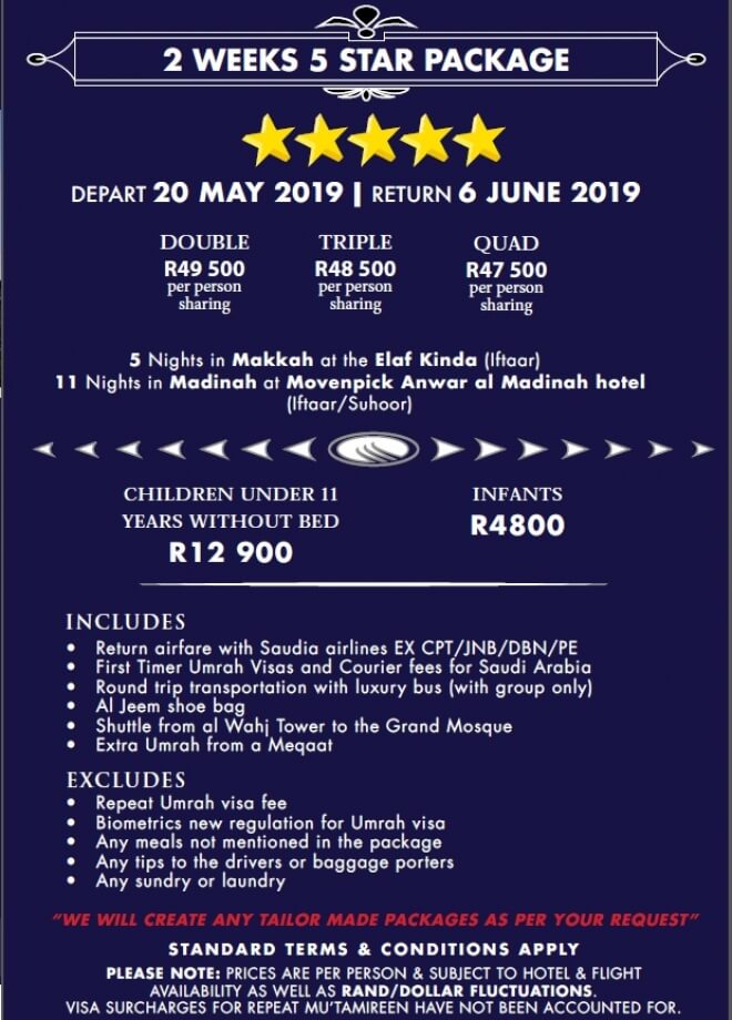 Disclaimer: Kindly check and confirm details with operators before booking. Package Information has been uploaded onto our website as received, and may have changed. Hotel Information has been sourced from websites like Google Maps, Wikimapia and Hotels.com. If any of the information is incorrect, kindly let us know via email: info@hajjumrahinfo.co.za - Shukran