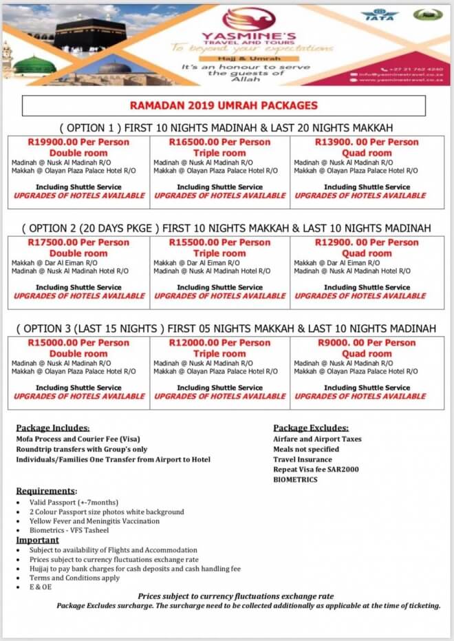 Disclaimer: Kindly check and confirm details with operators before booking. Package Information has been uploaded onto our website as received, and may have changed. Hotel Information has been sourced from websites like Google Maps, Wikimapia and Hotels.com. If any of the information is incorrect, kindly let us know via email: info@hajjumrahinfo.co.za - Shukran