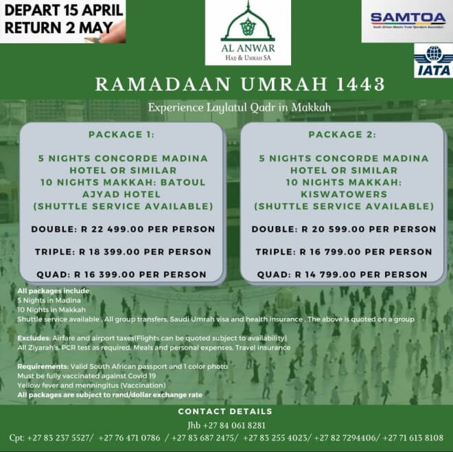 Disclaimer: Kindly check and confirm details with operators before booking. Package Information has been uploaded onto our website as received, and may have changed. Hotel Information has been sourced from websites like Google Maps, Wikimapia and Hotels.com. If any of the information is incorrect, kindly let us know via email: info@hajjumrahinfo.co.za - Shukran