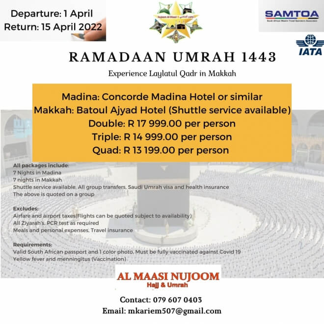 Disclaimer: Kindly check and confirm details with operators before booking. Package Information has been uploaded onto our website as received, and may have changed. Hotel Information has been sourced from websites like Google Maps, Wikimapia and Hotels.com. If any of the information is incorrect, kindly let us know via email: info@hajjumrahinfo.co.za - Shukran