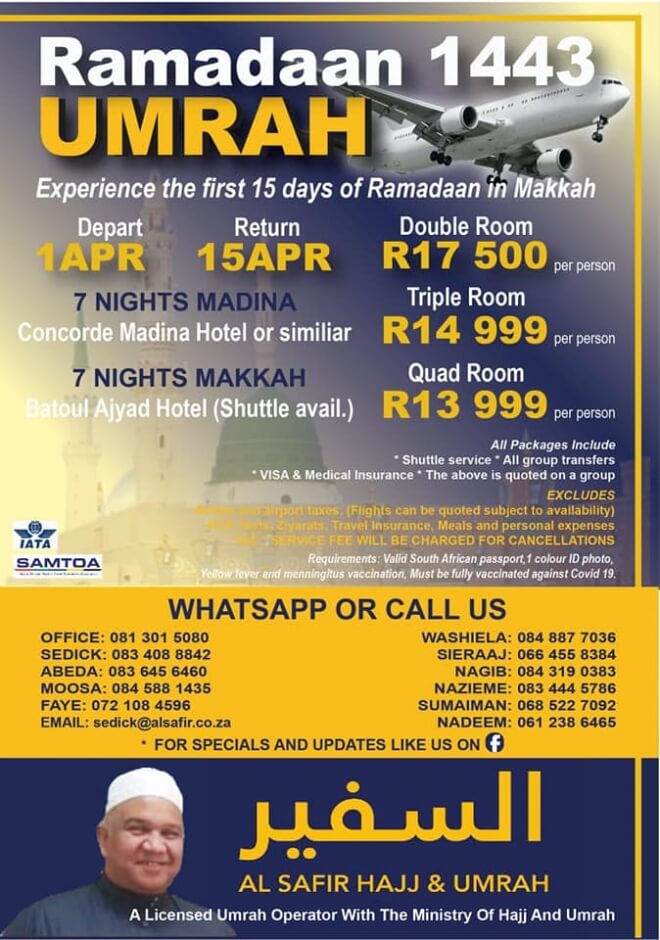 Disclaimer: Kindly check and confirm details with operators before booking. Package Information has been uploaded onto our website as received, and may have changed. Hotel Information has been sourced from websites like Google Maps, Wikimapia and Hotels.com. If any of the information is incorrect, kindly let us know via email: info@hajjumrahinfo.co.za - Shukran