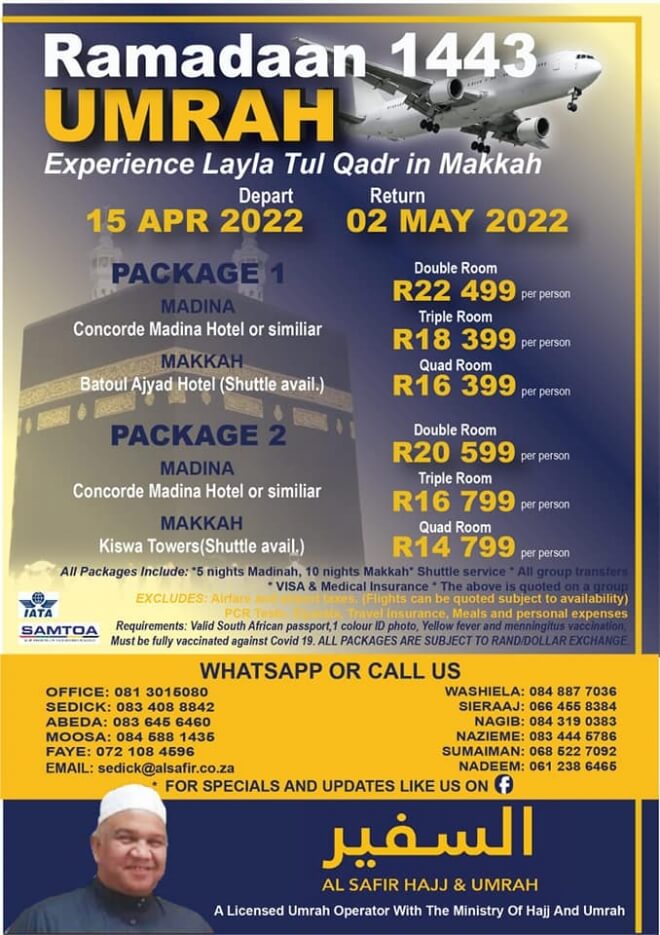 Disclaimer: Kindly check and confirm details with operators before booking. Package Information has been uploaded onto our website as received, and may have changed. Hotel Information has been sourced from websites like Google Maps, Wikimapia and Hotels.com. If any of the information is incorrect, kindly let us know via email: info@hajjumrahinfo.co.za - Shukran
