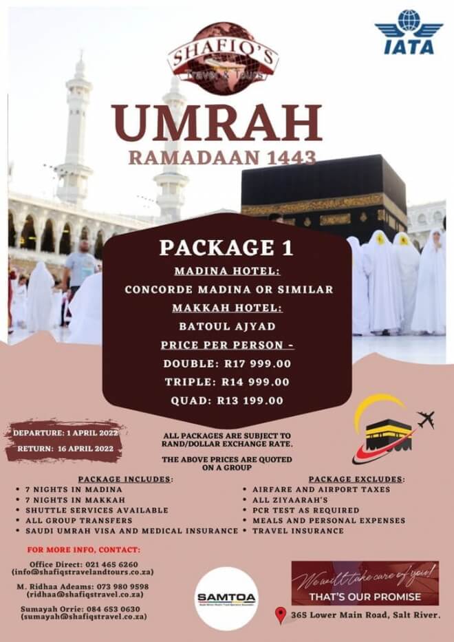 Disclaimer: Kindly check and confirm details with operators before booking. Package Information has been uploaded onto our website as received, and may have changed. Hotel Information has been sourced from websites like Google Maps, Wikimapia and Hotels.com. If any of the information is incorrect, kindly let us know via email: info@hajjumrahinfo.co.za - Shukran