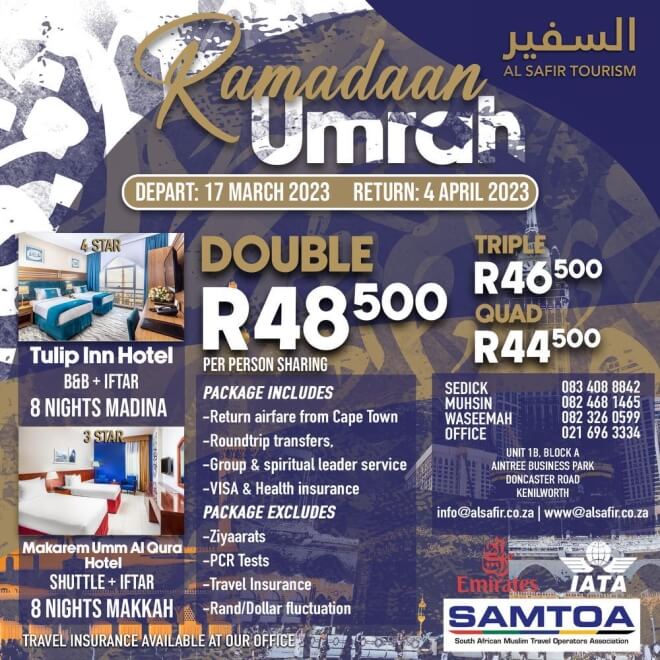 Disclaimer: Kindly check and confirm details with operators before booking. Package Information has been uploaded onto our website as received, and may have changed. Hotel Information has been sourced from websites like Google Maps, Wikimapia and Hotels.com. If any of the information is incorrect, kindly let us know via email: info@hajjumrahinfo.co.za - Shukran