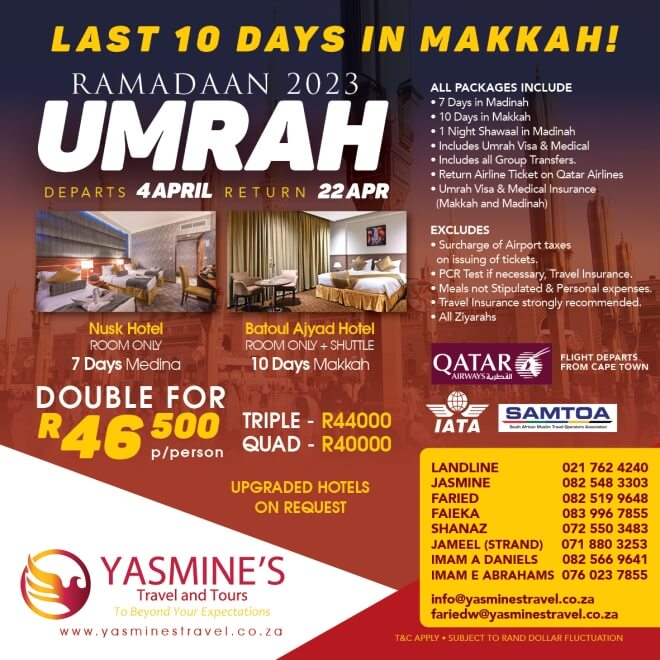 Disclaimer: Kindly check and confirm details with operators before booking. Package Information has been uploaded onto our website as received, and may have changed. Hotel Information has been sourced from websites like Google Maps, Wikimapia and Hotels.com. If any of the information is incorrect, kindly let us know via email: info@hajjumrahinfo.co.za - Shukran