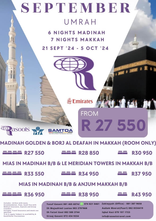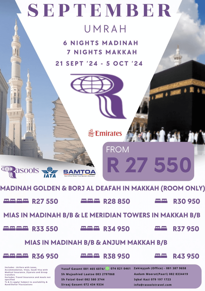 Disclaimer: Kindly check and confirm details with operators before booking. Package Information has been uploaded onto our website as received, and may have changed. Hotel Information has been sourced from websites like Google Maps, Wikimapia and Hotels.com. If any of the information is incorrect, kindly let us know via email: info@hajjumrahinfo.co.za - Shukran