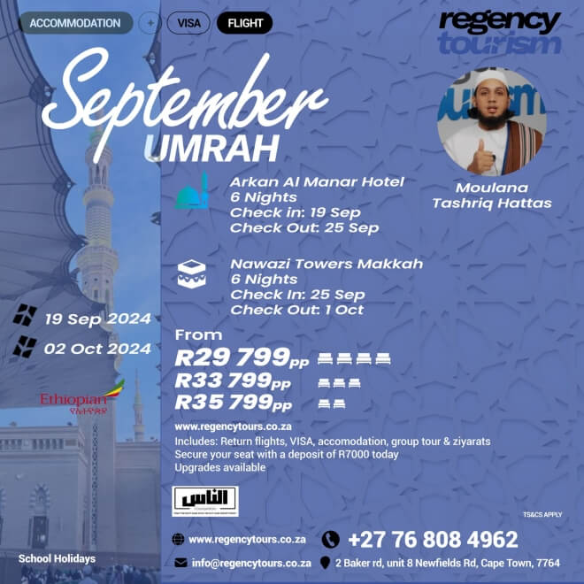 Disclaimer: Kindly check and confirm details with operators before booking. Package Information has been uploaded onto our website as received, and may have changed. Hotel Information has been sourced from websites like Google Maps, Wikimapia and Hotels.com. If any of the information is incorrect, kindly let us know via email: info@hajjumrahinfo.co.za - Shukran