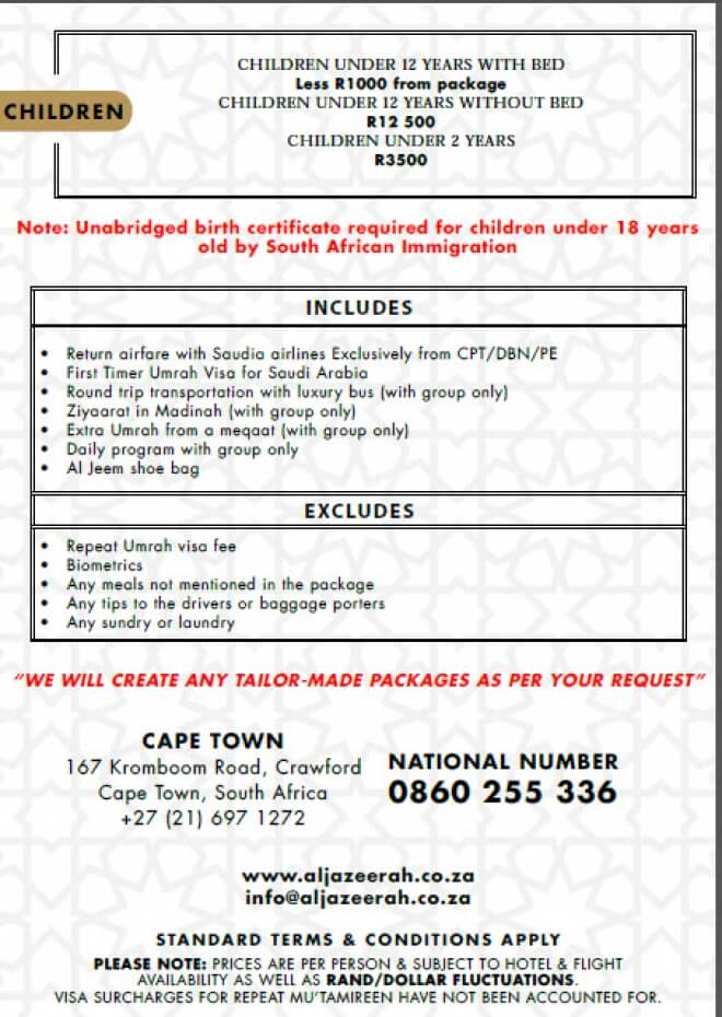 Disclaimer: Kindly check and confirm details with operators before booking. Package Information has been uploaded onto our website as received, and may have changed. Hotel Information has been sourced from websites like Google Maps, Wikimapia and Hotels.com. If any of the information is incorrect, kindly let us know via email: info@hajjumrahinfo.co.za - Shukran