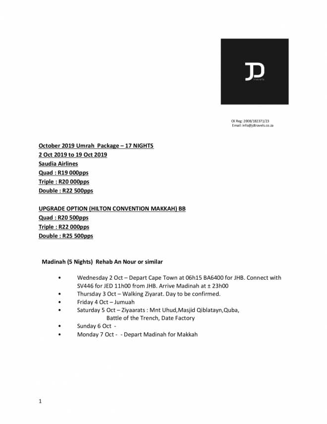 Disclaimer: Kindly check and confirm details with operators before booking. Package Information has been uploaded onto our website as received, and may have changed. Hotel Information has been sourced from websites like Google Maps, Wikimapia and Hotels.com. If any of the information is incorrect, kindly let us know via email: info@hajjumrahinfo.co.za - Shukran