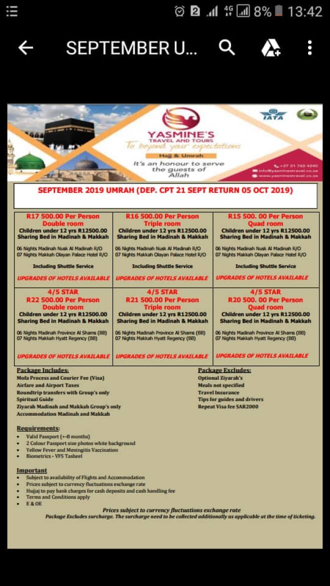 Disclaimer: Kindly check and confirm details with operators before booking. Package Information has been uploaded onto our website as received, and may have changed. Hotel Information has been sourced from websites like Google Maps, Wikimapia and Hotels.com. If any of the information is incorrect, kindly let us know via email: info@hajjumrahinfo.co.za - Shukran