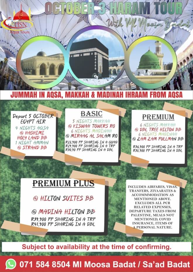 Disclaimer: Kindly check and confirm details with operators before booking. Package Information has been uploaded onto our website as received, and may have changed. Hotel Information has been sourced from websites like Google Maps, Wikimapia and Hotels.com. If any of the information is incorrect, kindly let us know via email: info@hajjumrahinfo.co.za - Shukran